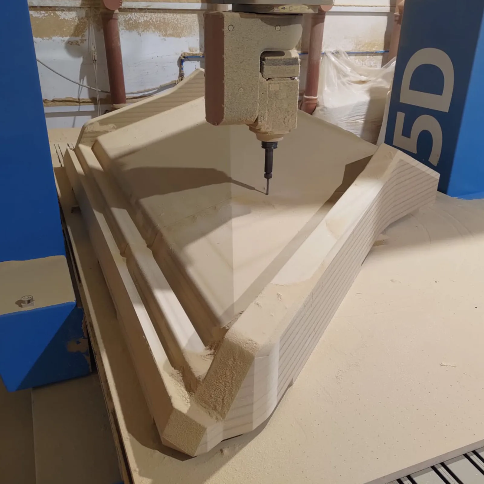 We machine model and tooling materials and aluminium from customer CAD on 5‑axis and 3‑axis CNC. Typical outputs include MDF thermoforming bucks, tooling‑board masters, EPS/XPS architecture volumes and cured tooling‑skin surfaces. We do not machine steel or cast iron.